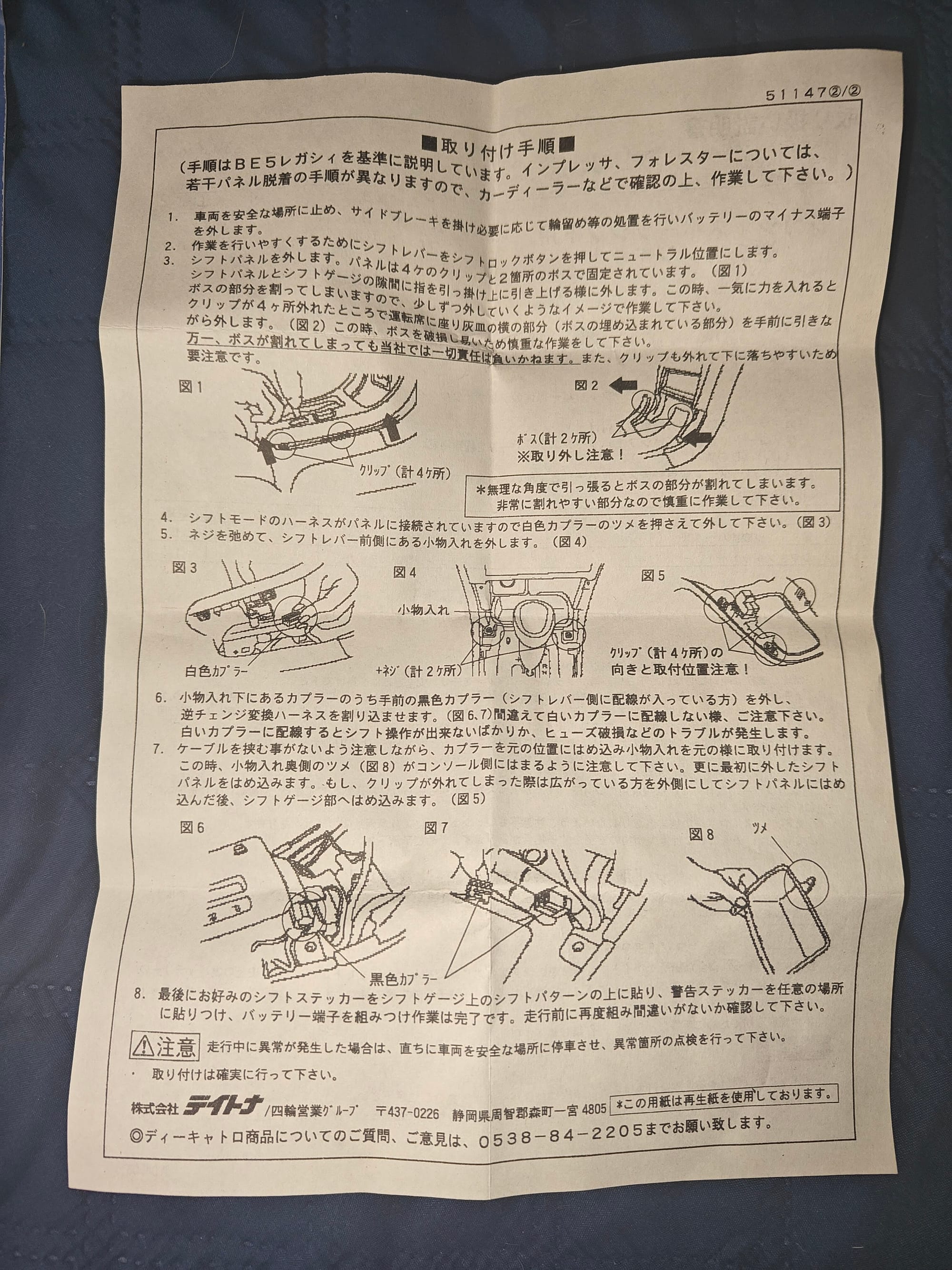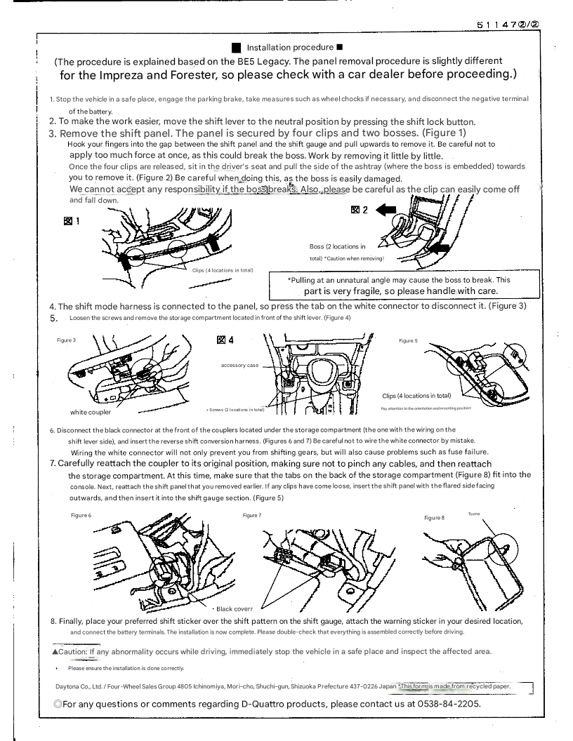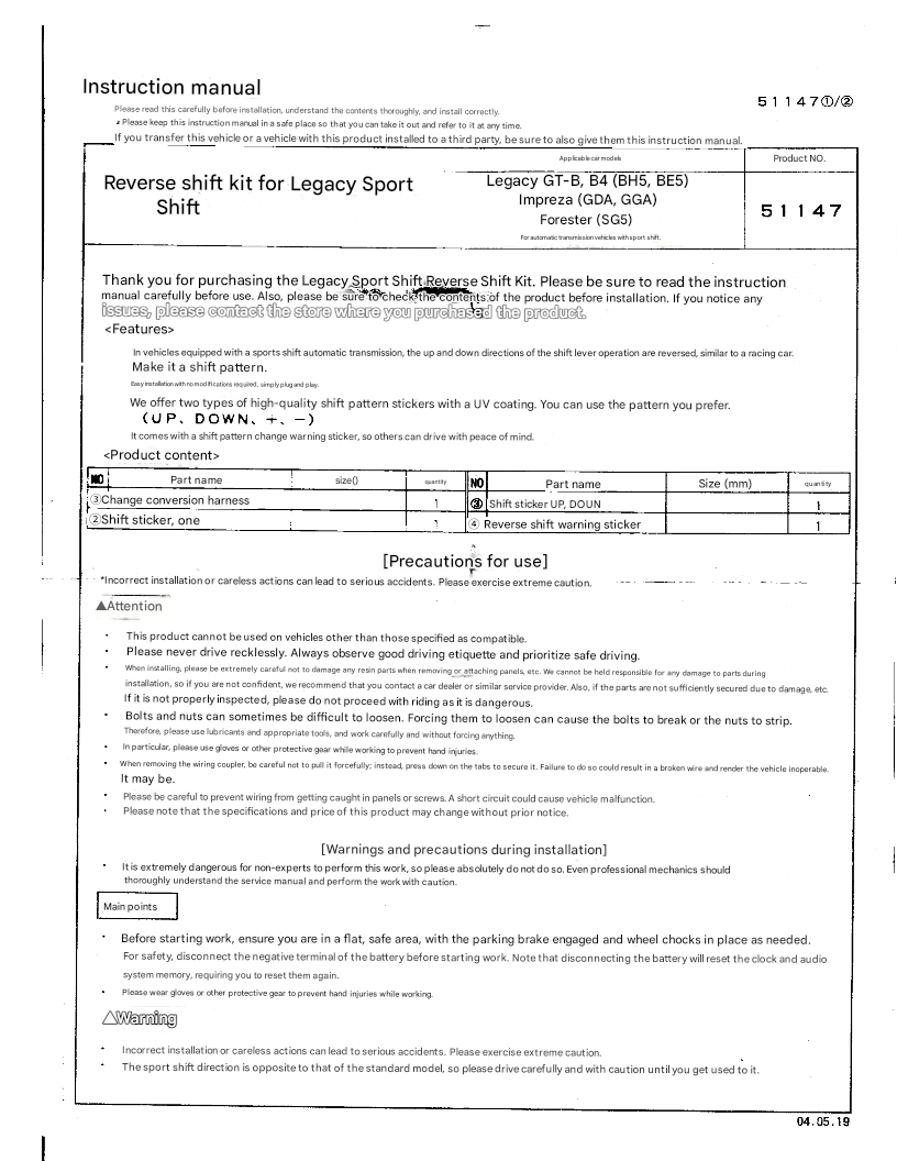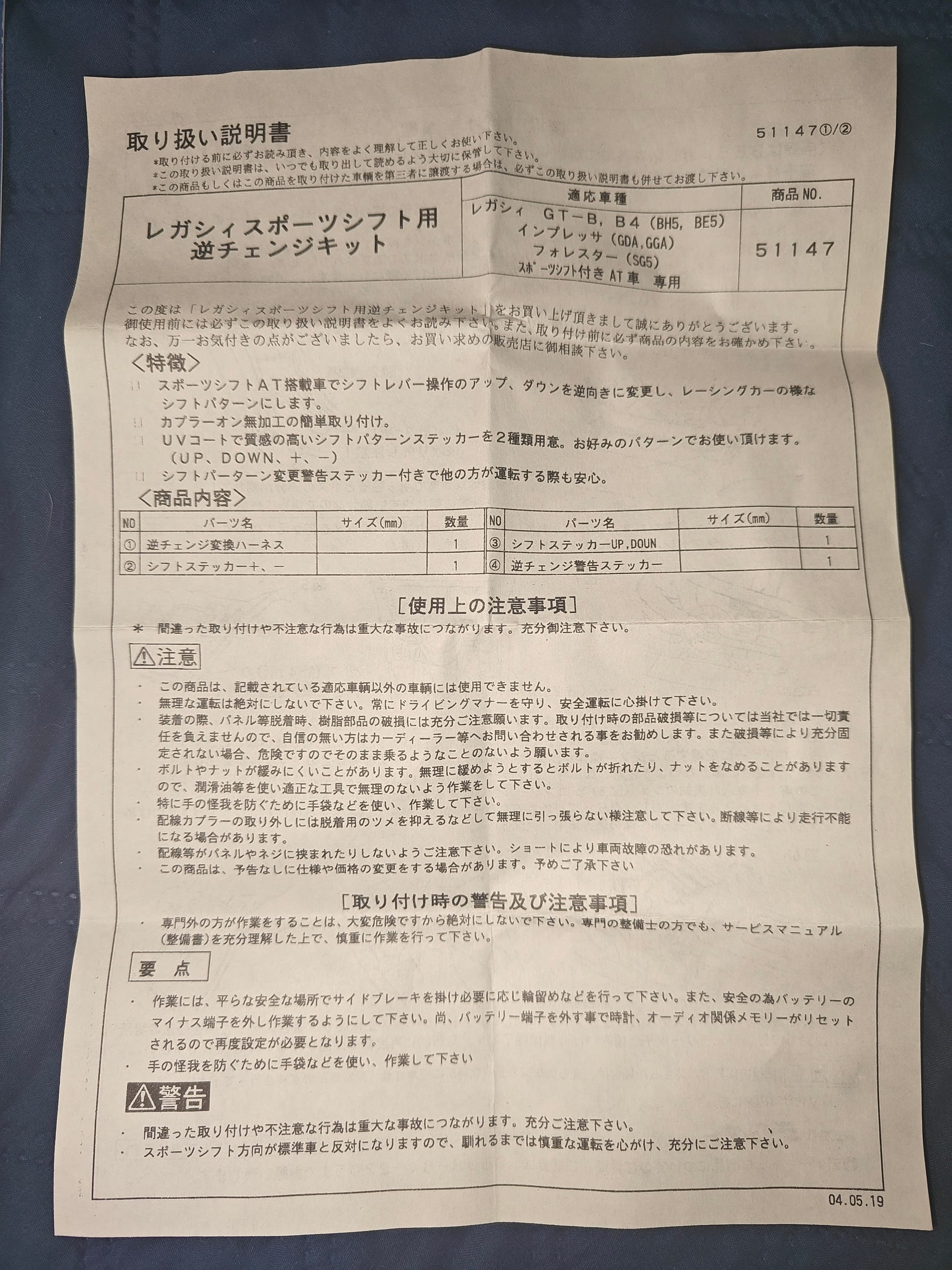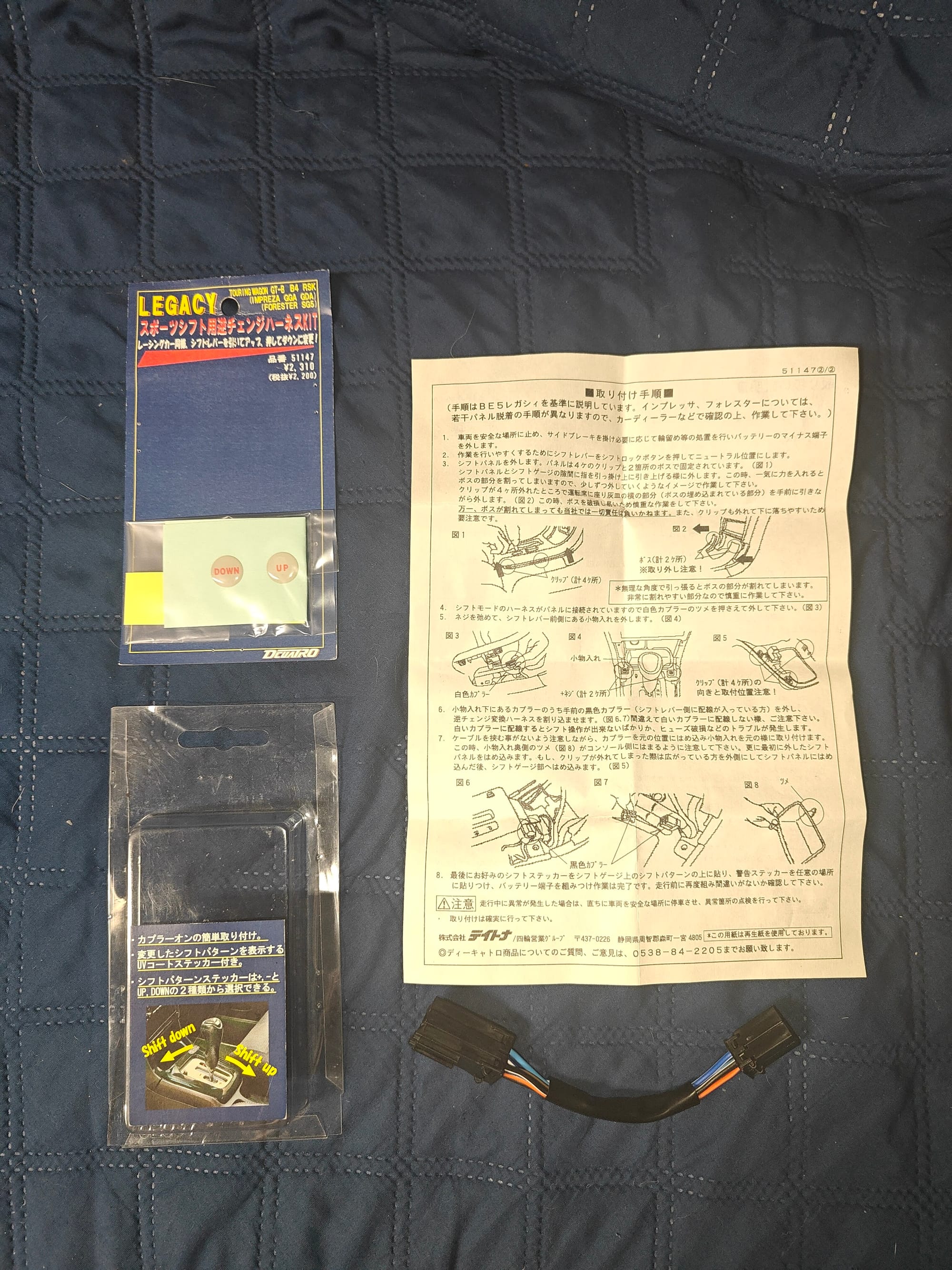 The DCUATRO Sport Shift Harness Kit has long since been discontinued to when it would have been in demand twenty years ago, and had variants to fit both the third generation Subaru Legacy, as well as the fourth generation. This harness, part number 51147, is also compatible with the second generation Subaru Forester and the bugeye-styled Subaru Imprezas that featured the same transmission. In the kit is the 6 pin harness, instructions, and two sets of UV-resistant stickers meant to go above the plus and minus signs on the shift lever. One set of stickers has plus and minus signs and the other says up and down; also included is a bonus sticker that says Reverse shift car, Pay attention to the shift lever direction!!