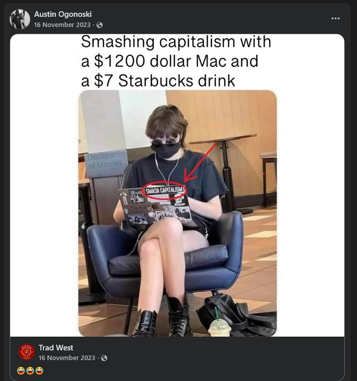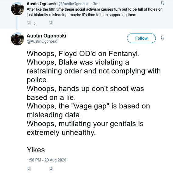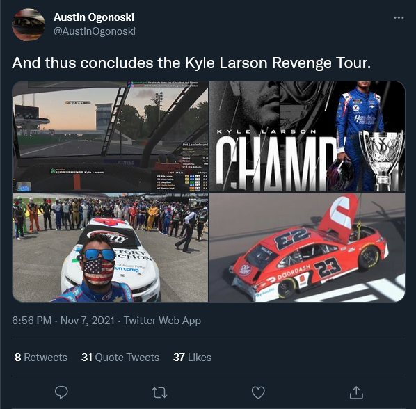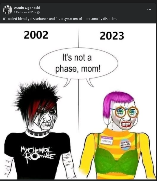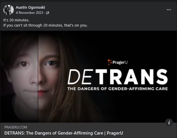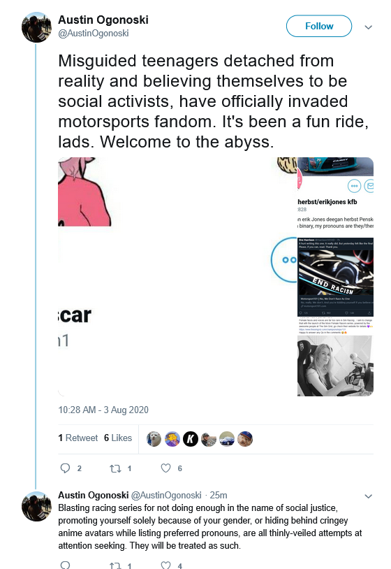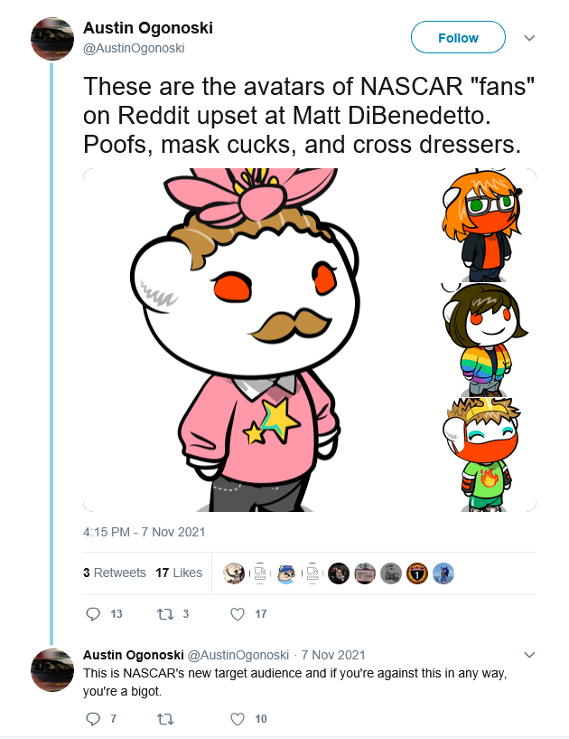 Similarly, Ogonoski is staunchly anti-feminist: boiling it down to "a bunch of women with various mental illnesses thinking that all men on the planet are conspiring to oppress them," and said "feminism is a synonym for nutjob," one paragraph later. On his Facebook, he has posted transmisogistic comments, calling it a "identity disturbance" and a "personality disorder" and posted transphobic content from far-right think tank PragerU and stochastic terrorist Libs of Tik Tok. He declared Kyle Larson's 2021 NASCAR Cup Series Championship campaign a "revenge tour" in lieu of failing upwards to Hendrick Motorsports and winning the championship after losing his ride at Chip Ganassi Racing after saying a racist slur during a iRacing race years prior, and made a mockery of Bubba Wallace in the process in lieu of the incident that took place at Talladega in 2020. And this was just what I was able to dig up.